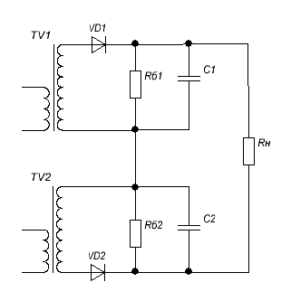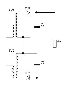 Выпрямители, каждый, заряжают соответственно С1 и С2, а уже из них, соединенных последовательно, в Rн течет ток, в правильном направлении 😀 .