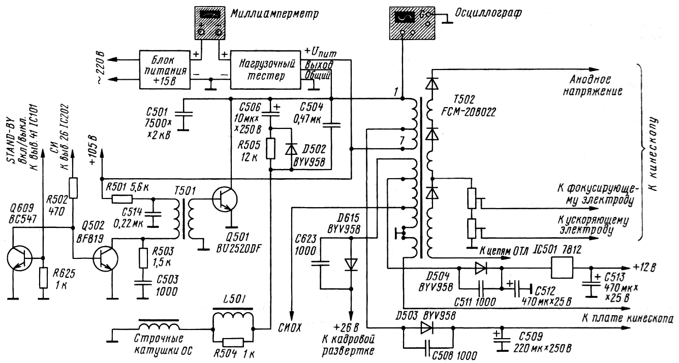 Каждый строчник должен иметь свой выпрямитель и свой сглаживающий конденсатор, что тоже понижает требования к Uмах диодов и кондеров уровнем 10кВ, далее методом последовательного сложения источников, кому три (30кВ), кому нужно четыре (40кВ), а кому пять(50кВ)