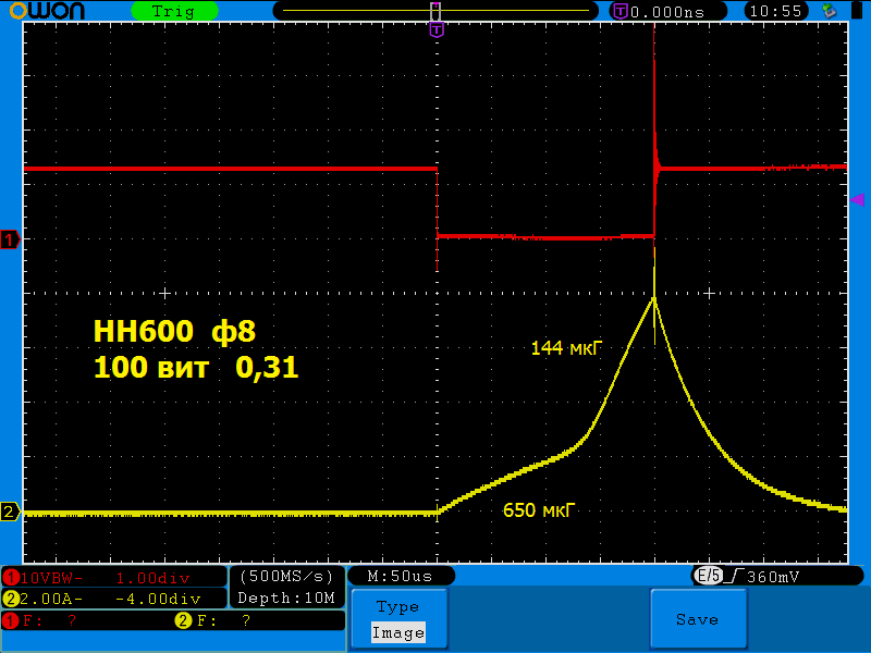 А вот если залезть в насыщение и начать размагничивать импульсом тока оттуда, то видно что точно тот же линейный участок перемагничивания проходим всего за 2 ампера.