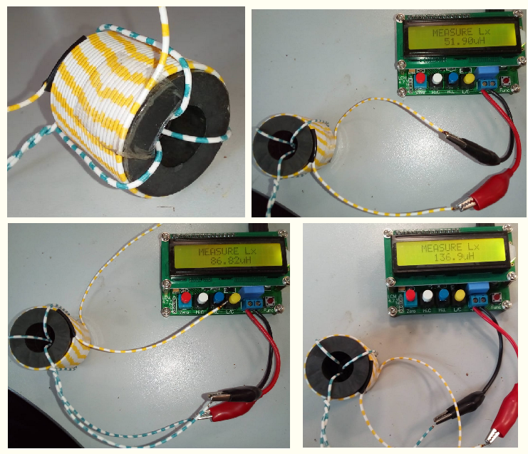 3 ферритовых кольца К32х16 сложены вместе, сверху расположена цилиндрическая обмотка (желто-белый провод) и тороидальная (сине-белый провод).