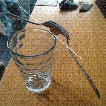 Да, чтоб вас ...! Не поленился, собрал систему, ни хрена не получается, падают вилки. Для того, чтобы точно сделать центр тяжести на краю стакана, нужно гнуть вилки с точностью до десятой миллиметра, а может и до сотой. Просто взять вилки, вставить пятак ни у кого не получится.