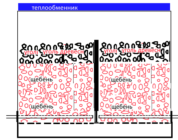 В моём варианте раскалённый щебень нужен для разложения воды перед тем как она попадёт на угли.Может это и лишнее... Ну не могу я без трубы... Дико это так...без трубы....