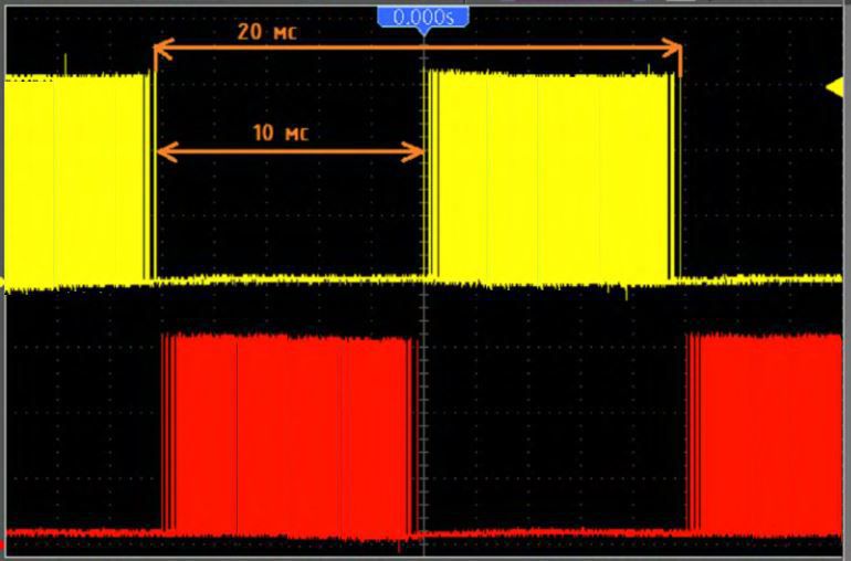 А в это время желтая линия- напряжение на катушке теслы начинает плавно нарастать. Забирает потихоньку энергию из поля.
