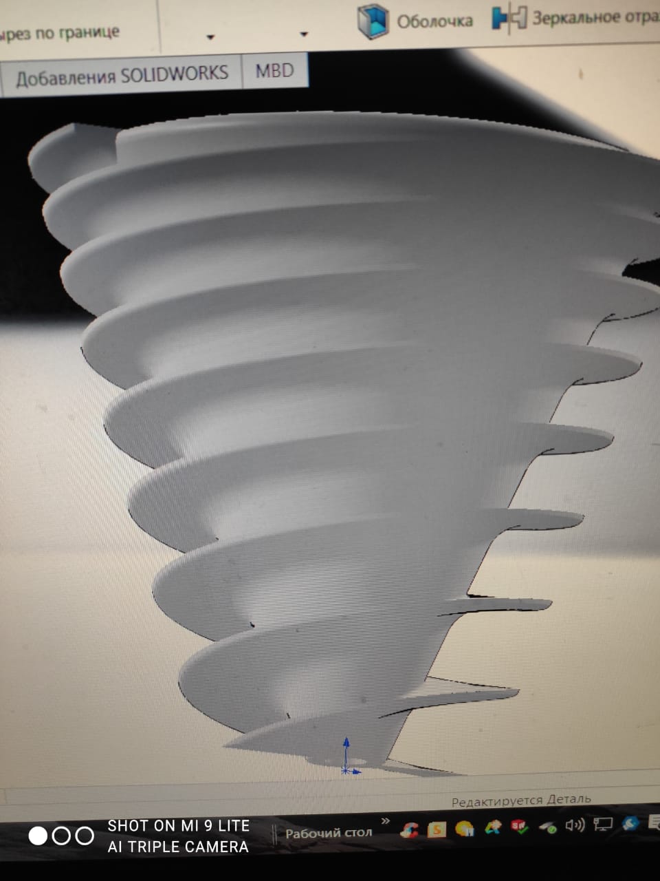 Но вот в чем проблемка, для водяной гайки нуен клдч, который удержит её от вращения. И этим клдчём мозет быть только её собственная инерция. Но инерция покая воды поступающей в насос не вечнв. Соприкасаясь с ротором вода начнёт по маленьку раскручиваться в след за ротором. А значит действе ротора на воду будет снижаться. 6апример чтглы яжёлую гайку навернуть на болт не касаясь гайки, нужно чтолы болт всё время увеличивал обороты своего враения. Если ускорения не будет то из за трения гайка начнёт вращаться в след за болтом и достигнув скорости болта, она перестанет двигаться вдоль болта. В случае с жидкой гайкой эта проблема решается при помощи формы ротора, если сделать ротор, расширяющимся к выходу, то линейная скорость его лопастей начнёт расти с увеличением радиуса. При этом угловая скорость лкдет везде одинаковая. Учитывая все эть ньюансы я стал рисовать крыльчатку для насоса и смотрите что у меня получилось.