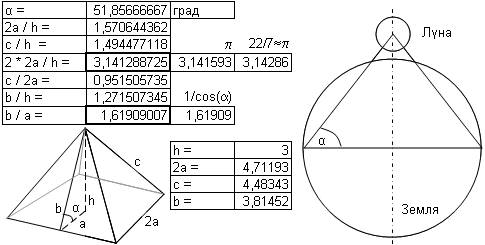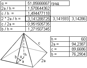 Боковые грани пирамид, подобных египетским, это пол ромба с диагоналями в "золотой" пропорции ~ 1.618034 Т.е. из двух таких ромбов получаются все 4 грани пирамиды. Думаю, так проще, чем с углами возиться.