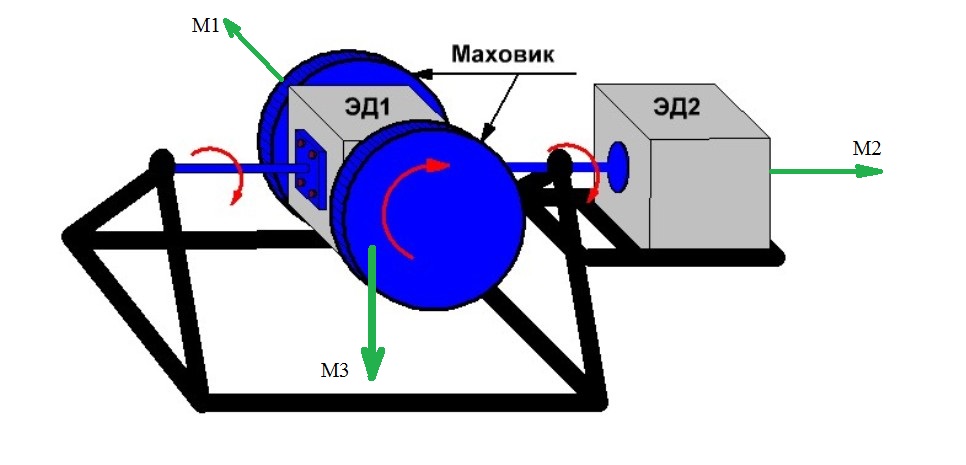 На схеме добавлены зелёным цветом векторы действующих моментов: М1 - кинетический момент маховиков-гироскопов, М2 - момент, приложенный к гироскопам от мотора ЭД2, М3 - результирующий момент гироскопов (гиромомент), который стремится повернуть раму относительно вектора М3.