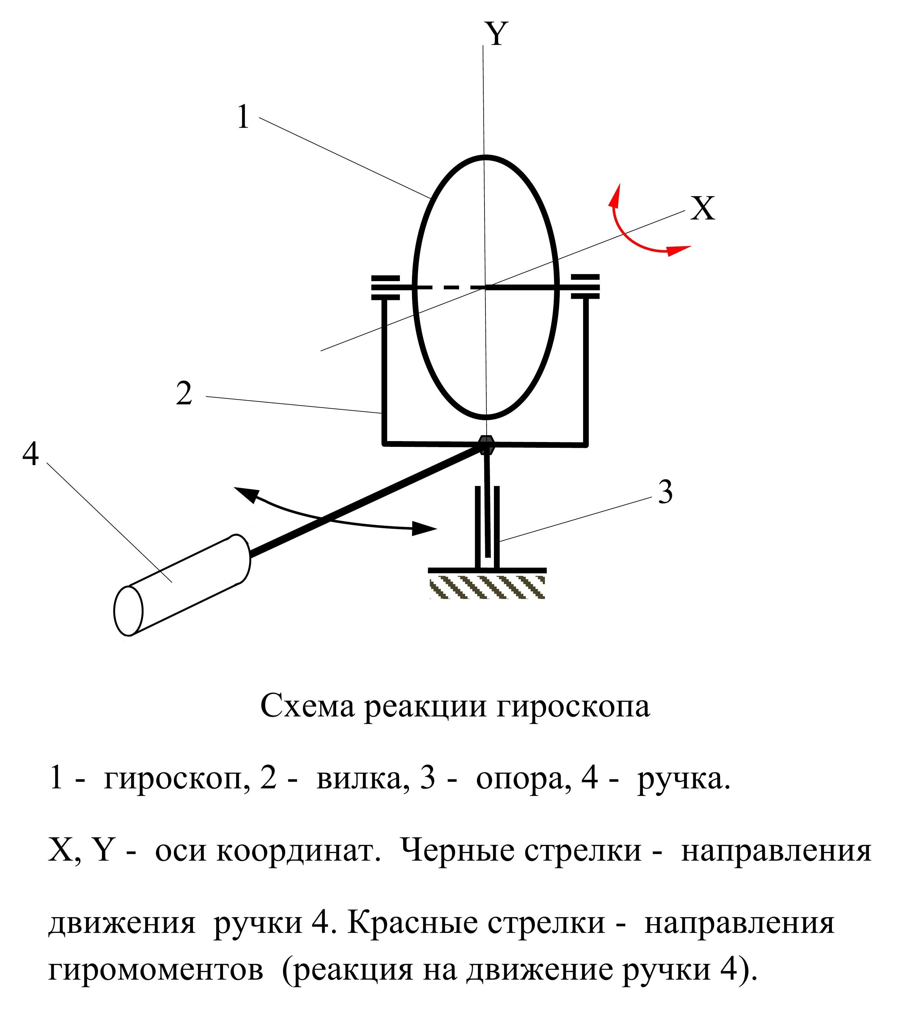 Ручка 4 позволяет поворачивать плоскость XY гироскопа 1, установленного на вилке 2, относительно оси Y. Вилка 2 установлена в опоре 3. Опора 3 не даёт поворачиваться гироскопу 1 относительно оси Х. Если действовать рукой на ручку 4 по направлению черных стрелок (вращение относительно оси Y), то гироскоп 1 своим гиромоментом действует по направлению красных стрелок на вилку 2, которая не позволяет ему поворачивать свою плоскость относительно оси Х. В результате, рука не испытывает противодействия.