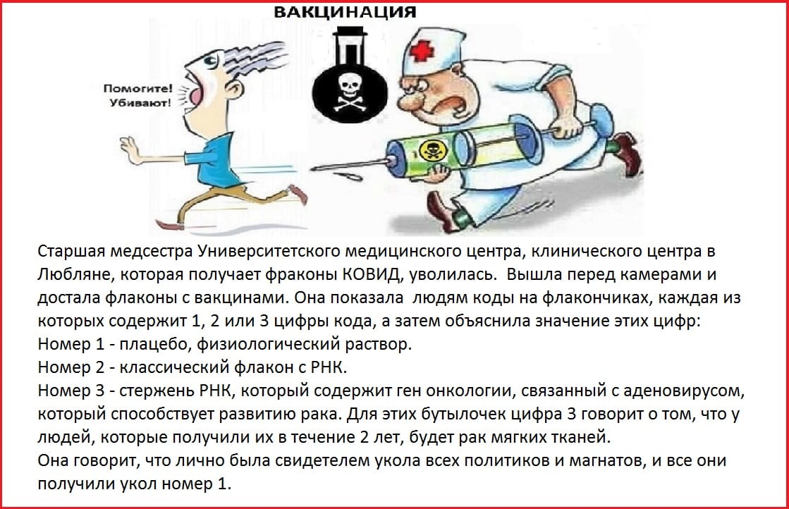 В телеге на днях было, одна главная по ковиду в Словении выдала инфу. жижа делится на 3 вида, с кодами 1, 2, 3. Олигархам, магнатам, политикам колят 1.- плацебо. Остальным с маркерами и вызывающее онкологию.