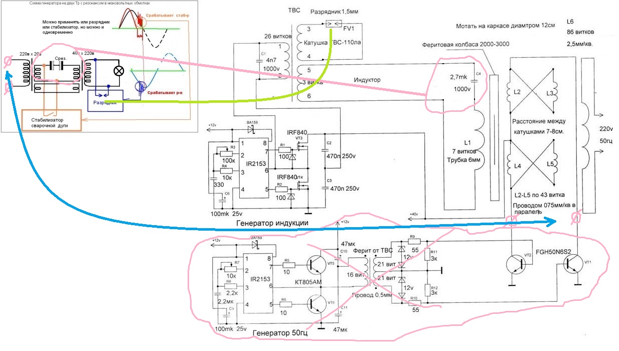 Валера начинал с ШОКЕРА, и от него, зажигал через разрядник, лампу 150вТ/220в. Затем решил зажечь 150вТ/220в от ТВС или ТДКС также через разрядник, но здесь возникла первая проблема, не горит, нужен конденсатор по выходу ТДКС. Появилась цепь: БП – ГЕНЕРАТОР – ТДКС – С*(ёмкость) – разрядник – лампа 150/220. Её надо настроить, на максимальное горение лампы. В этой цепочке (схеме) всё критично и не критично, кроме «С*» она должна быть в пределах 500-1000пкФ, (мы знаем что ёмкость 2-3nF заряженная до 3000в. при разряде в импульсе может дать ток в несколько АМПЕР). Почему 500-1000пкФ, ответ прост: следующий шаг, нам надо ЁМКОСТЬ заменить на БИФИЛЯР. Но ёмкость БИФа должна быть ровна ёмкости С* (мы как бы ёмкость заменили на ёмкость). Теперь требование выросло, надо настроить систему так, что бы горело ТРИ включённых последовательно 150/220. Снова проблема как мотать БИФ, в два провода в одну линию, вся наша доступная изоляция это 50Гц и 1000в. Мотать в два слоя, изоляцию меж слоями можно усилить, но длины L1 и L2 в БИФе должны быть равны и по ИНДУКТИВНОСТИ так же равны, (мотаем L2 секционно от края до края). Думаю у Валеры на старте было две жилы по 10м. Здесь придётся немного по играться, с ёмкостью БИФа и ИНДуктивностью L1 L2 (длина), с целью получения максимального эффекта. Третий шаг, подключение трансформатора, для первичного преобразования полученной мощности в ТОК. Здесь снова свои особенности, не смотря на простоту решения. Первичка транса БИФ (вопрос: диапазон частот эффективной работы), второе плавающая нагрузка.