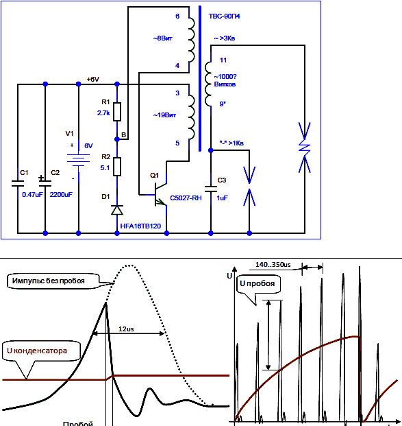 Транзистор использовал КТ908А,конденсатор на 100нан. Эта схема при правильном подключений концов проводов которые идут на возбуждение ТДКС сразу при включений даёт дугу в три с половиной-четыре сантиметра (при неправильном всего полсантиметра) которую можно ещё растянуть сантиметров до шести,чтобы получать искры нужно параллельно выходу ВН подключать конденсатор,он хоть и высоковольтный но немного при работе нагрелся. С ним через бифиляр зажёг лампу,горит почти как от высоковольтного вывода монитора, свечи для разрядника нашёл нормальные советские с нулевым сопротивлением.