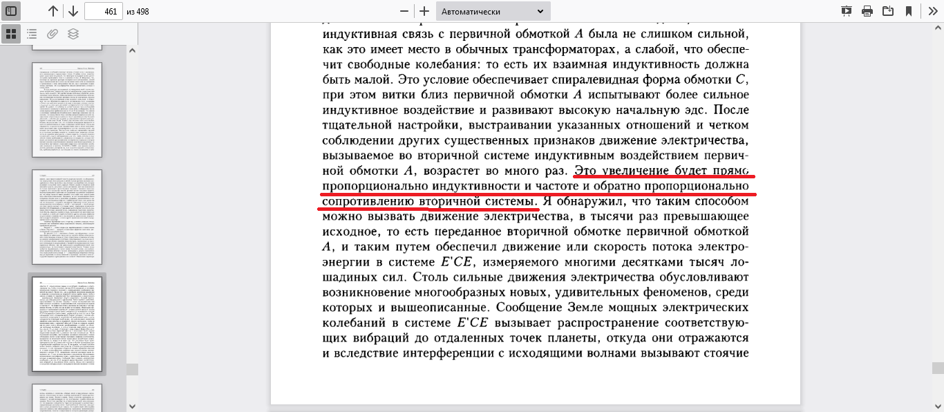 было не перепугался! 😀 Энергия всё-таки прямо пропорциональна частоте! Частота идёт как множитель: хочешь в тысячи раз больше - делай килогерцы, хочешь в миллионы раз больше - делай мегагерцы. Тесла явно об этом тут говорит.