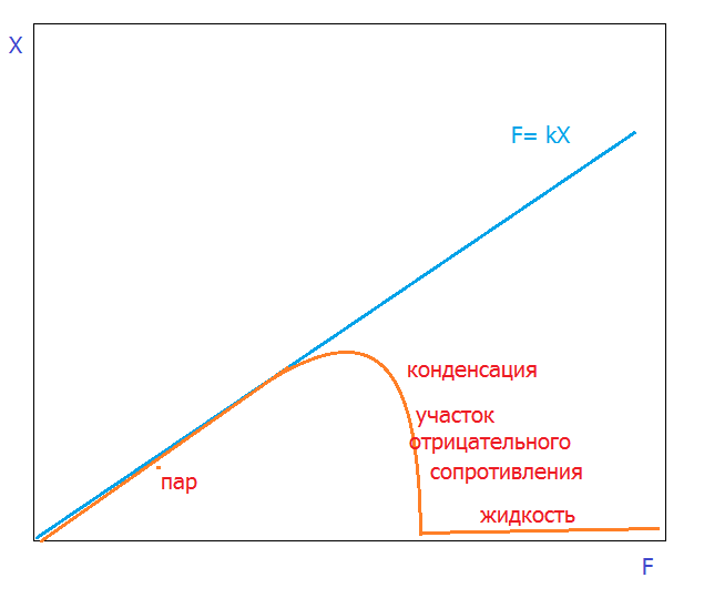 А вот для паров жидкости все гораздо интереснее- там мало того. что нелинейная характеристика, так еще и присутствует участок отрицательного сопротивления. А это однозначное условие возможности генерации.