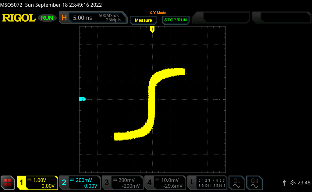 на первой картинке полноценная петля гистерезиса для замкнутого пермаллоевого сердечника,1500 витков, ток на шунте 40мА, снимаем на 50 Гц, источник- прямоугольное напряжение амплитудой. 18,5В .