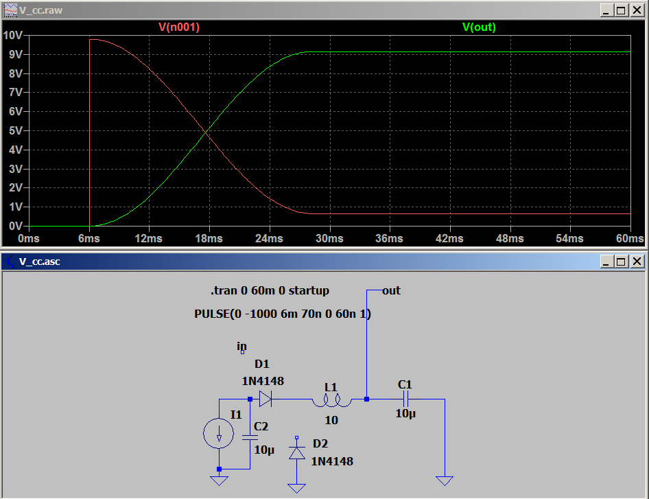 Вот простая схемка- первый кондерчик мы заряжаем коротким импульсиком от источника тока. А дальше все по учебнику- нет никаких чудес.