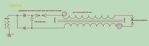 3. Накачка нужна внешняя, для этого на рисунке скипетра, ниже хвостов видим начало бифилярной обмотки, это и есть безопасная зона, цветочки потому там и растут... Предполагаю, что это и есть место накачки. Вообщем один в один схема самощелкающего бифа по Динатрону и Романову. Если биф настроен и запущен, то процесс щелкания продолжается самопроизвольно и достаточно долго...