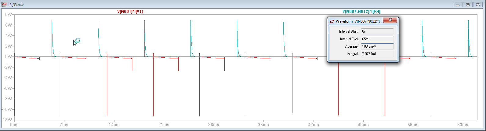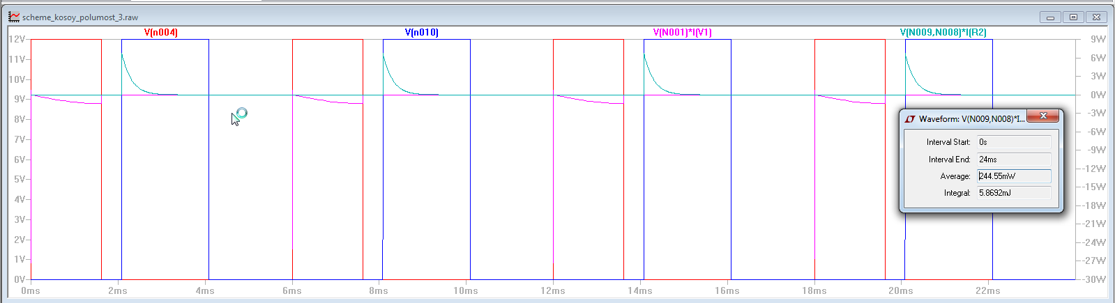 четвертая осциллограмма -график мощностей крупно, для наглядности - один период, красным -потребление из источника, синим мощность в нагрузке.