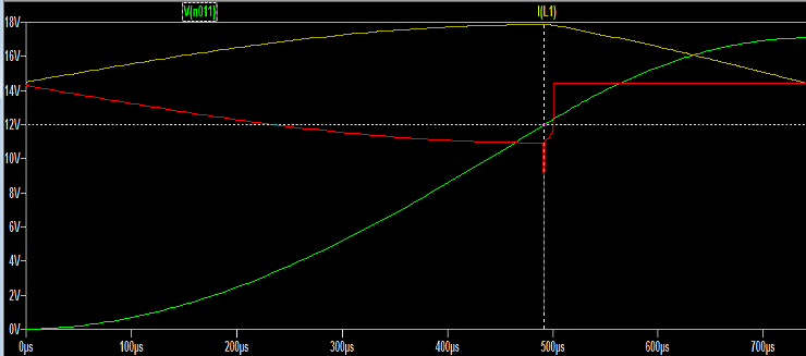 Красный - это ток на резисторе 0,1 Ом, который стоит на выходе из источника.