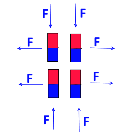 Но может быть можно ещё попроще механизм придумать? Что,если попытаться использовать электромагнитные силы вместо электростатических? Т.е так же как и в электростатическом варианте нужно будет использовать две пары катушек с током, наводящие друг в друге токи которые можно использовать в нагрузку но притягивающиеся в одной "плоскости" и отталкивающиеся в другой..... И далее нужно просто придумать,а точнее использовать уже готовый механизм взаимной нейтрализаций сил аналогичный рассмотренному.... Ну если такой механизм придумать для катушек не получится то придётся строить таки электростатические генераторы.... Ниже на рисунке примерное расположение полюсов катушек изображённое в виде магнитов И получающиеся в них силы притяжения и отталкивания. Надо только грамотно их друг с другом столкнуть через привод