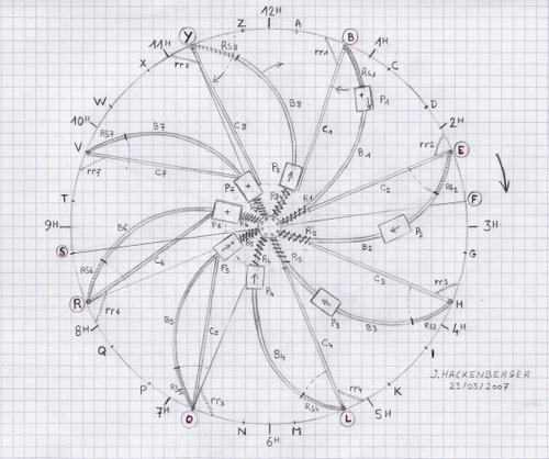 to Чимбик - эта гравюра была найдена на французком сайте исследователями колеса-Bessler, и по утверждению французов эта гравюра тех же времен что и основная, но из других "книжек". Я только стянул ее, так как никогда раньше не встречал. Расположение грузов мне тоже не понятно - не удается найти логику в рисунке (разве что Bessler сам мог что то специально не так попросить нарисовать), но есть еще современный рисунок с того же французкого сайта, современная попытка расшифровать гравюру, они там тоже ломают голову на форуме и видимо гравюру с грузами кто то в архивах нашел, хотя конечно могли и просто пошутить.