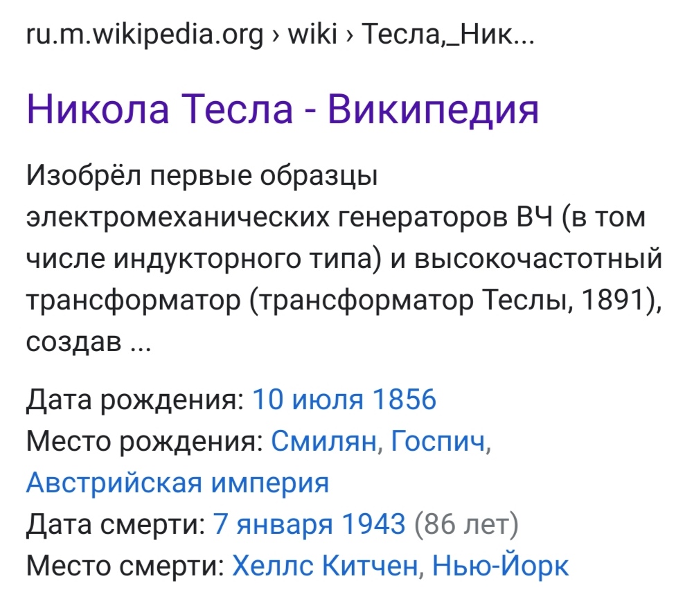 Сейчас в Википедию зашёл посмотреть, что открыл Тесла, да, действительно, он много что открыл и изобрёл, а вдруг он что то не озвучил в своих открытия? Это тоже не известно, может что то утаил от общественности. Тогда получается смысла в этом открытии нет ни какого, отсюда вывод, что все об этом знают, а может все таки не знают? Вот смотрят на это и не знают что это 😎