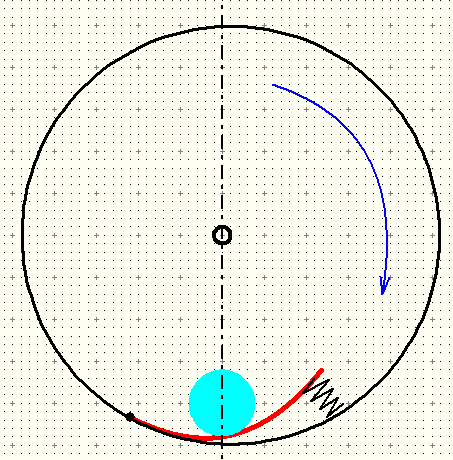 Сила прикладывается к дуговой поверзности рычага, в точке касания шара с рычагом. Радиус вращения в каждое его мгновение направлен под углом 90° к вектору инерции и вектору скорости шарика.