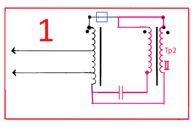 Далее решил всё же выяснить,а возможен ли всё таки сам компенсационно-последовательный резонанс. Оказалось возможен. Перекоммутировал схему как на нижнем рисунке... Подключил питание от автотрансформатора и сравнил токи которые гуляют внутри схемы по красной цепочке с питающим током через синий квадрат. Оказалось что они в 10 раз выше чем ток через синий квадрат. Т.е. компенсационно-последовательный резонанс тоже существует.Видно что схема немного напоминает схему Иеронима,но его схема работает с немного разных числом витков и с сильной магнитной связью, обмотки мотаются сдвоенным проводом вместе. Но токи всё равно маленькие, надо контур запитывать 110 вольтами чтобы получить резонансный ток в 1 ампер и питающий в 0,1ампер. Отключение компенсирующей части второго трансформатора(правой половинки) тут же приводит к феррорезонансу и вышибанию. пробок.
