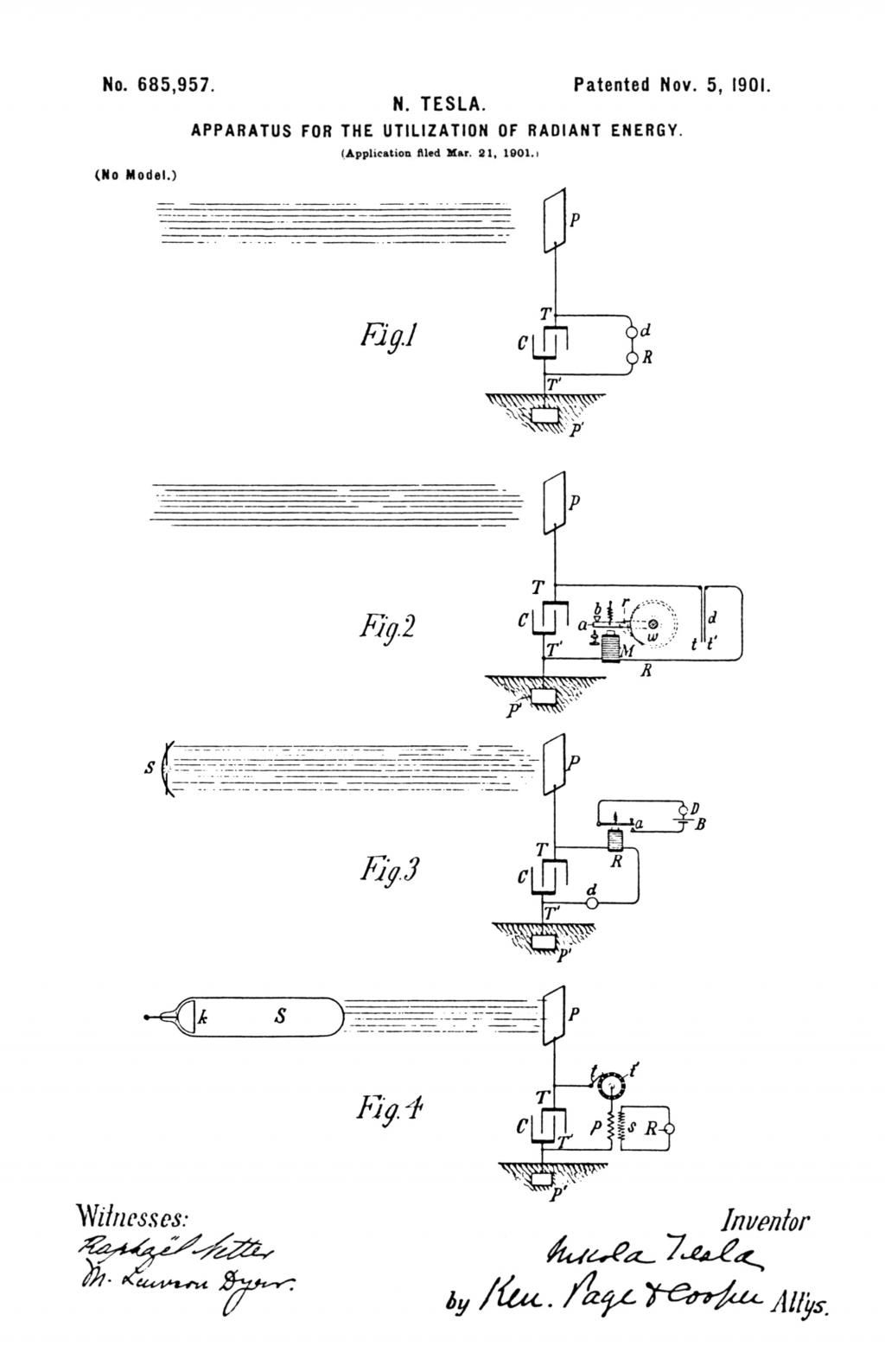 ..."Настоящая заявка основана на открытии, сделанном мной для случая, когда лучи или излучение описанного типа падает на изолированное проводящее тело , соединенное с одним из зажимов конденсатора, и, пока другой его зажим за счет независимых устройств принимает или уносит электричество, а изолированное тело подвергается воздействию лучей, в конденсатор поступает ток, и при условиях, излагаемых далее, в нем происходит неограниченное накопление энергии. После соответствующего промежутка времени, в течение которого действуют лучи, эта энергия может проявиться в форме мощного разряда, который можно использовать для управления механическими или электрическими устройствами или многими иными способами"...