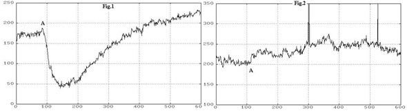 Второй график, Fig.2 когда конус раструбом был напрравлен на кондер сбоку, а в 1,5 метрах дальше сидел я. Тонкий импульс на кривой - это я выпил первую стопочку водки, и закусил краковской колбаской новгородского производства. Тогда я это и заметил на экране монитора. Подождал немного и тяпнул вторую. И вы видите на графике второй импульс. На этом графике подъем кривой не слишком выражен, поскольку масштаб мельче.