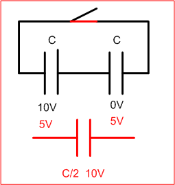 имеем два конденсатора по 10 мкф, один заряжен до 10В, второй не заряжен, после перезаряда на них будет по 5В, факт экспериментально устанавливаемый, надеюсь спорить никто не будет?