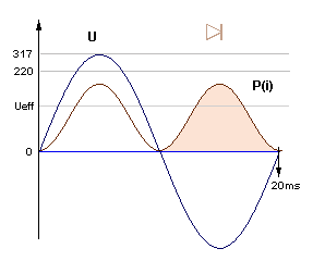Привет всем! Вот пытаюсь решить задачку. Представьте, что лампочка включена в сеть 220 В через диод ( так часто делают в подъездах, чтобы лампочка долго не перегорала). Действующее напряжение на лампочке будет соответственно 110 В. Средний действующий ток через лампочку также уменьшится вдвое. Стало быть средняя мощность P=UI уменьшится вчетверо. Это понятно и нормально. Если параллельно этой цепи: лампочка+диод включить точно такую же цепь: лампочка+диод, только диод включить обратно по отношению к первому. Вторая лампочка будет гореть также как и первая, только используя другой полупериод тока. Мощность, выделяемая второй лампочкой будет также вчетверо меньше номинальной. Вместе две лампочки дадут общую мощность вдвое меньше, чем одна, просто включенная в сеть! Однако при этом оба полупериода тока будут проходить через одинаковые сопротивления одинаковых лампочек, т.е. как при прямом включении одной лампочки. Это можно проверить амперметром. Куда делась половина мощности?