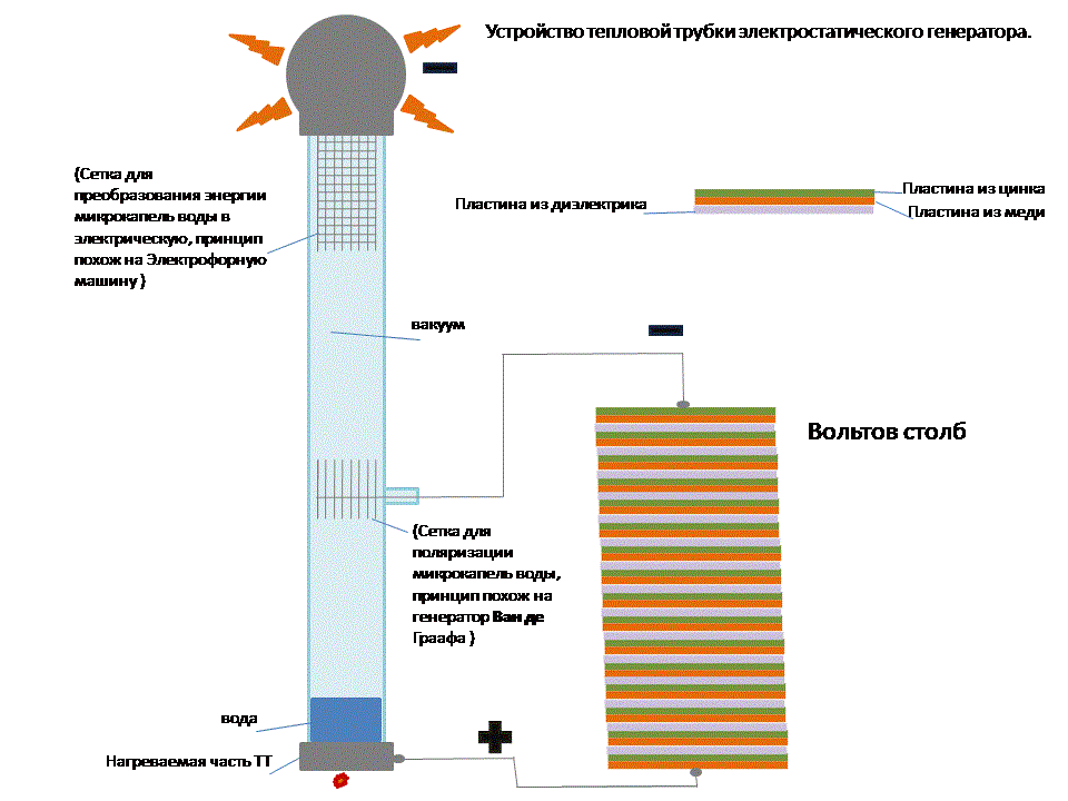 Вот я и подумал использовать похожий принцип поляризации, что и в Английском звонке для конденсации паров в тепловой трубке. Тепловая трубка, выполнена из изолятора (стекла) на рисунке неуказано.