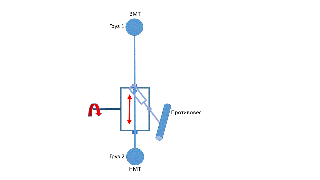 На левом рисунке видим переходной процесс при вращении вокруг оси всего механизма, а на правом рисунке указано положение грузов только если противовеса нет или он имеет меньший вес чем грузы1,2 и ещё необходимо учитывать центробежную силу при вращении всей системы вокруг своей оси.