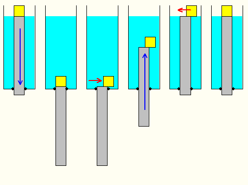 3 - на поверхности поплавок снова сдвигается, нижняя поверхность скрывается и стержень снова тонет.