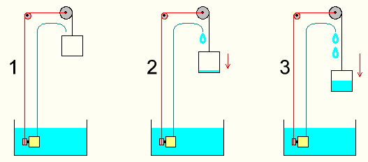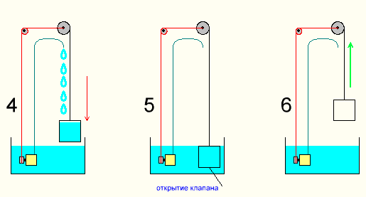 Поднятие емкости - это затраты. Но, учитывая, что поднимается она пустой (вода вытекает через клапан в дне), они должны быть небольшими в сравнении с полученной работой от движения вниз емкости с водой.